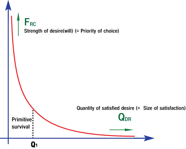 If the amount of desire satisfaction (\( Q_{DR}\)) and the intensity of desire ( \( F_{RC}\) ) can be properly quantified, the relationship between the two can be expressed in the following equation. (In the context, they will be represented as 'Qdr' and 'Frc', respectively).