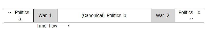 In the above diagram, the process referred to as "politics b" is the process in which the survivors of war 1 act to enhance their survival abilities. This politics b (or politics a and c) is a situation where there is no activity of attacking and killing others with weapons, and I will call this process "canonical politics." In canonical politics like politics b, political actors enhance their survival abilities, and as a result, their interest relationships may clash, and at the same time, each actor's understanding and judgment may also conflict, leading to the outbreak of War 2.