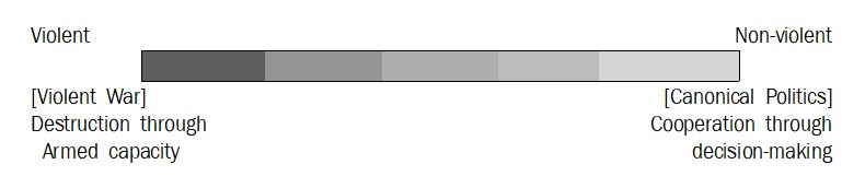 The above [Diag.2.A.2] demonstrates the logical continuity between war and politics. When politics is considered as a continuation of war, politics and war become essentially the same, so to distinguish the two ends of the whole, "violent war" and "canonical politics" are contrasted. This means that war is performed in a very gentle and soft manner in canonical politics, while canonical politics is performed in a very extreme and violent manner in violent war.